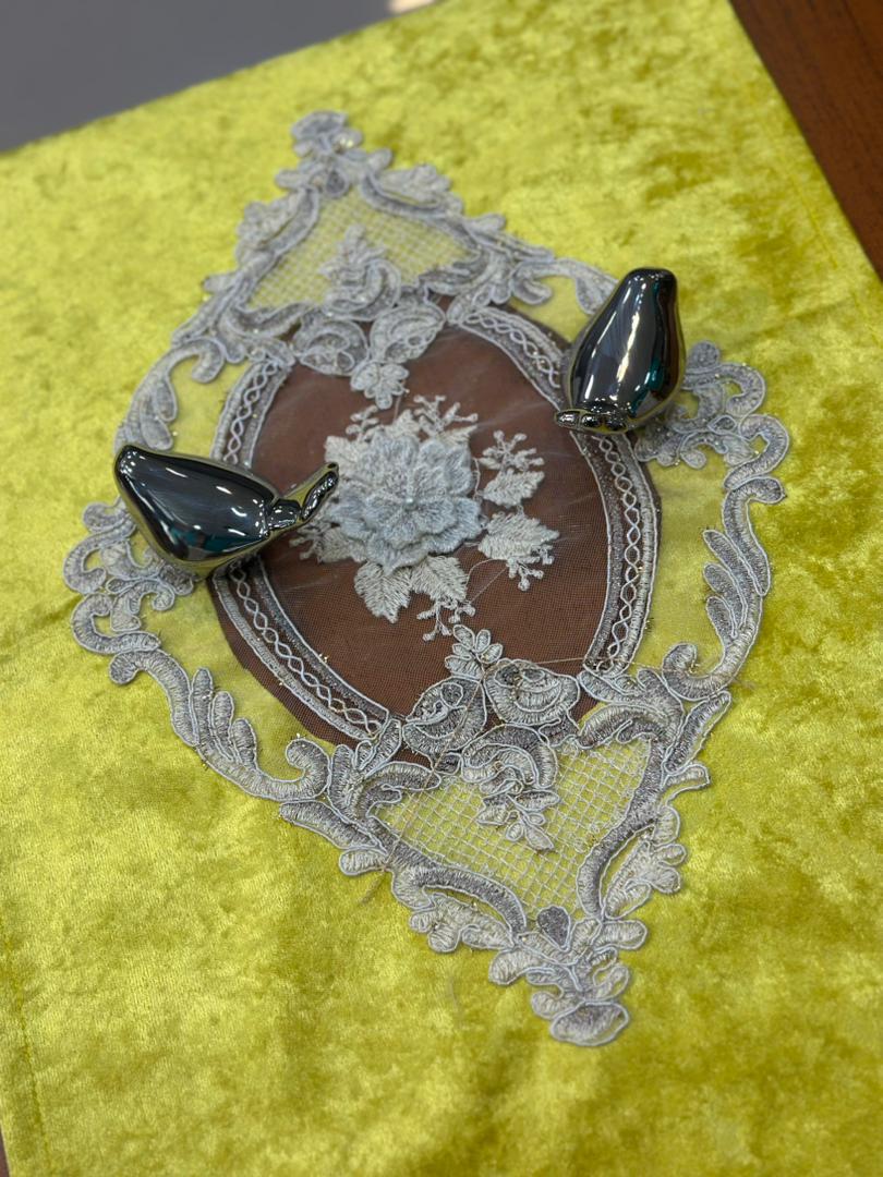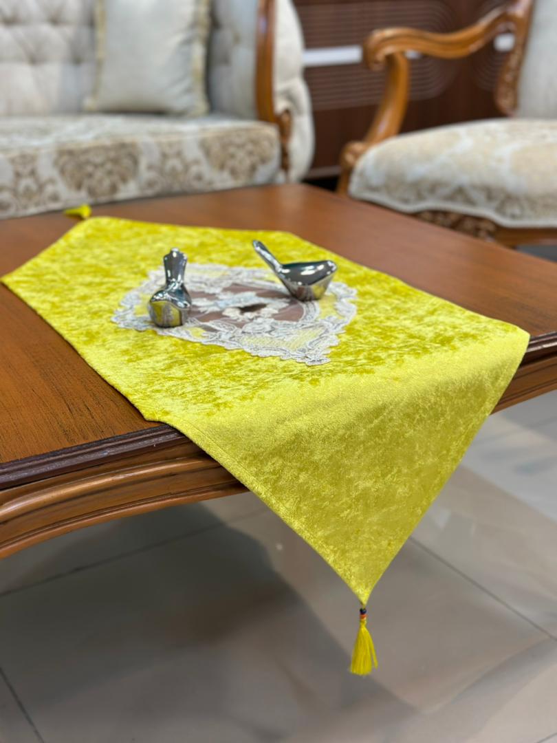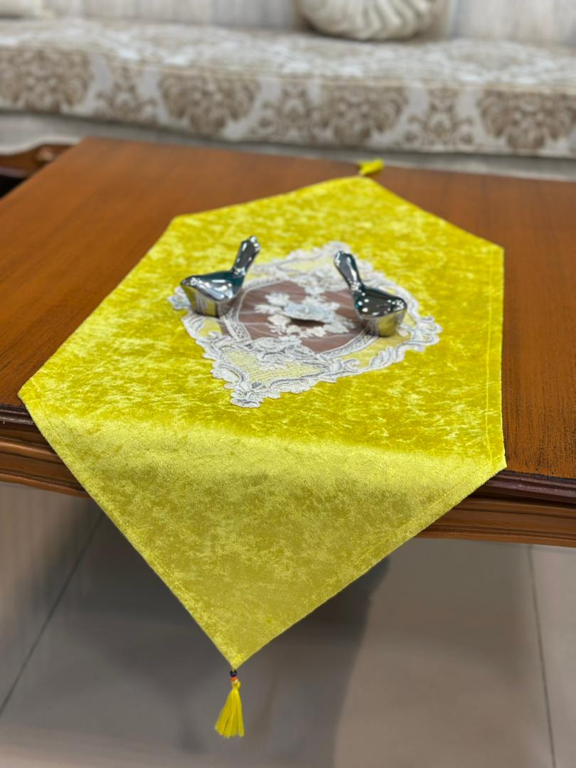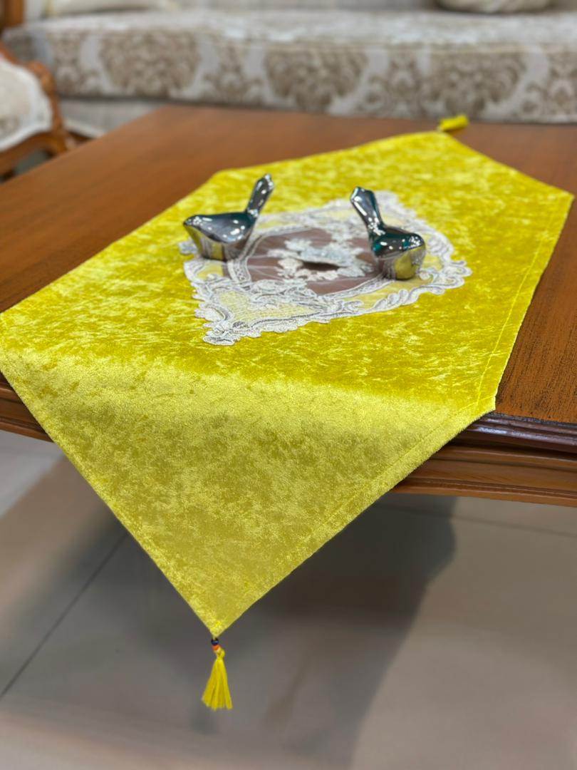 ابعاد رانر 90*35 ابعاد عسلی35*40 جنس پارچه از مخمل و پتینه سیم دوزی شده